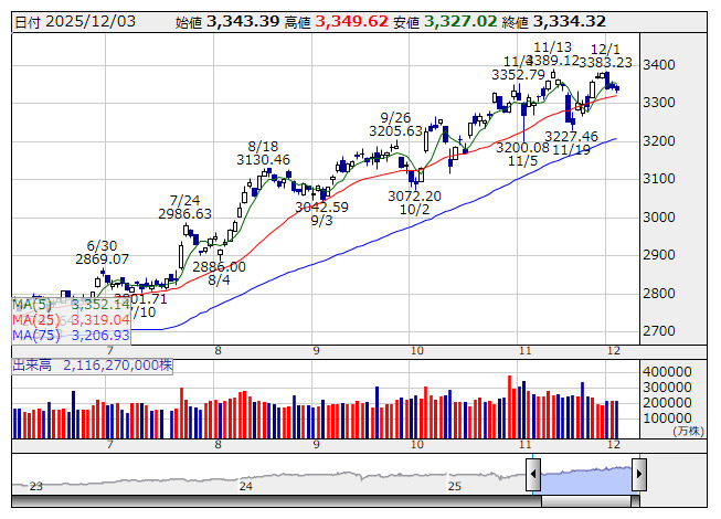 TOPIX <日足> 「株探」多機能チャートより3434.13ポイント ボリンジャーバンド3σ