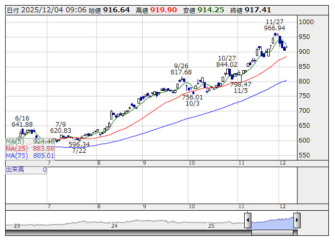 鉱業 <日足> 「株探」多機能チャートより●東証33業種 値上がり: 20 業種 値下がり: 13 業種