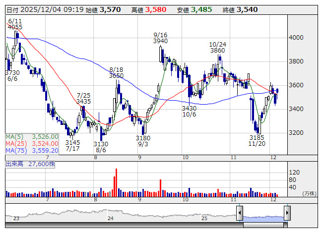 11月26日に8612円まで買われた後は調整をみせているが、8000円近辺での底堅さが意識されており、押し目狙いのスタンスに向かわせそうだ。ボリンジャーバンドは11月半ばの+3σ水準から、足もとの調整で+1σを割り込んでおり、過熱感は後退した。なお、パラボリックは直近の下げでSAR値にタッチしたことで、陰転シグナルを発生させている。