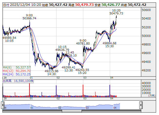 2025年12月04日10時25分 【市況】日経平均の上げ幅が600円突破 日経平均 <5分足> 「株探」多機能チャートより 日経平均株価の上げ幅が600円を突破。10時24分現在、615.05円高の5万479.73円まで上昇している。 株探ニュース