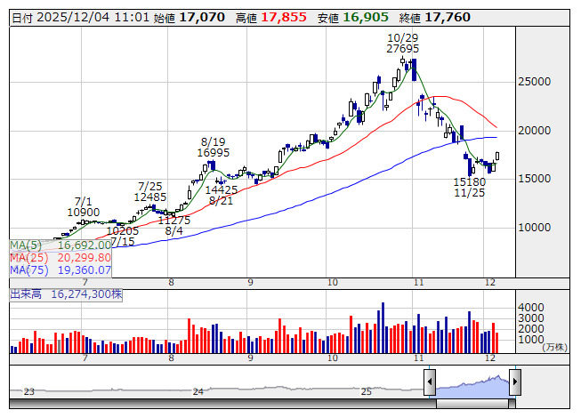 2025年12月04日11時01分 【材料】ソフトバンクG---大幅続伸、CFOインタビュー報道など伝わり SBG <日足> 「株探」多機能チャートより ソフトバンクG<9984>は大幅続伸。後藤CFOでは、10兆円規模の負債について「保有株の価値が急落したとしても安全な水準」、多額の社債発行も「決して不健康ということはない」、今後の資金調達についても「余裕がある」などとコメントしている。財務面に対する過度な警戒感の後退にもつながっているようだ。雇用指標などを受けた利下げ期待の高まりを背景に、米ナスダック指数が上昇していることなども支援材料とみられる。 《HM》 提供:フィスコ