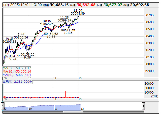 【市況】13時の日経平均は812円高の5万677円、SBGが299.83円押し上げ