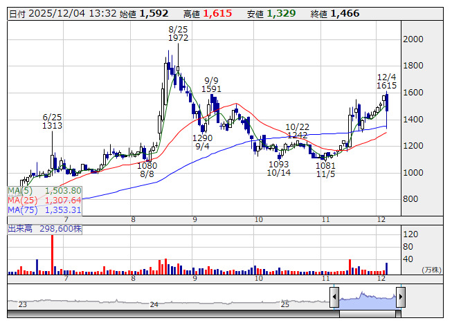 大幅反落。株主優待制度の拡充を発表も売りが優勢となっている。7単元以上一律30,000円分の株主優待から、優待還元額を固定し、対象株主にて按分するシェア型株主優待へと変更する。同制度における優待還元額は「3,000万円」とする。なお、当該金額は、25年9月末日を対象とする株主優待(予定配布額:約500万円)の約6倍の水準、26年3月末日を対象とする株主優待(予定配布額:約1,500万円)の約2倍の水準となる。27年3月末日を対象とする株主優待より内容の変更を適用する。