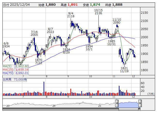 ノーリツ <日足> 「株探」多機能チャートより1)本日(12月4日)引け後に発表された決算・業績修正