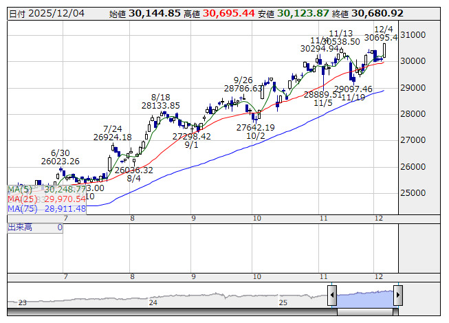 2025年12月05日08時46分 【市況】JPX日経400先物:5日寄り付き=255ポイント安、3万430ポイント JPX日経400 <日足> 「株探」多機能チャートより 5日8時45分、JPX日経インデックス400先物期近2025年12月限は前日清算値比255ポイント安の3万430ポイントで寄り付いた。前日のJPX日経インデックス400の現物終値3万680.92ポイントに対しては250.92ポイント安。 株探ニュース