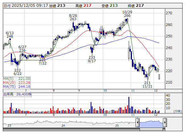 1840>は反落している。4日の取引終了後、25年10月期通期業績について、売上高が前回予想の320億円から314億5600万円(前の期比5.5%減)、営業損益予想が500万円の黒字から1億2200万円の赤字(前の期は1億5200万円の黒字)、最終損益予想が500万円の黒字から9300万円の赤字(同7億5800万円の黒字)に下振れして着地したようだと発表しており、業況を嫌気した売りが出ている。なお、期末配当予想は据え置く。住宅事業で分譲住宅の販売が計画通りに進まなかった。加えて、リフォーム事業で大型物件の引き渡しが遅延し前回予想の売り上げに届かなかったうえ、売上総利益率も低下した。