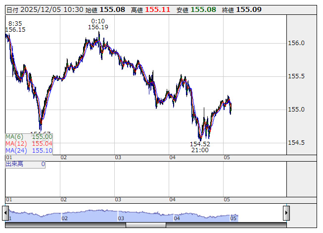 米ドル/円 <5分足> 「株探」多機能チャートより5日午前の東京市場でドル・円は154円90銭台で推移。155円23銭まで反発したが、ドル買いは続かず、154円92銭まで値下がり。155円以下には顧客筋などからのドル買い注文が入っているようだが、まとまった規模ではないようだ。ただ、アジア市場で155円を継続的に下回る可能性は低いとみられてる。ユーロ・円は弱含み、180円77銭から180円51銭まで下落。ユーロ・ドルは1.1641ドルから1.1653ドルまで反発。