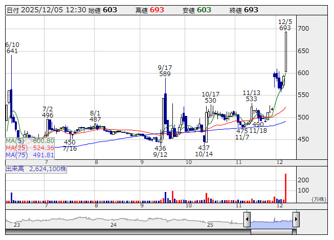 JMACS <日足> 「株探」多機能チャートより※出来高変化率ランキングでは、直近5日平均の出来高と配信当日の出来高を比較することで、物色の傾向など市場参加者の関心を知ることができます。
