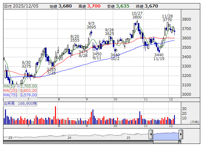 カナモト <日足> 「株探」多機能チャートより12月5日の引け後に決算を発表した銘柄のなかから、業績好調や配当増額など市場で評価される可能性の高い銘柄を取り上げた。