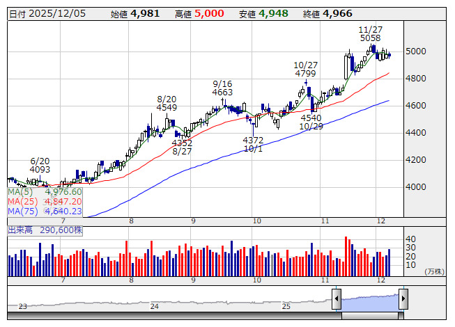 上組 <日足> 「株探」多機能チャートより(東証プライム上場 1605 銘柄対象)