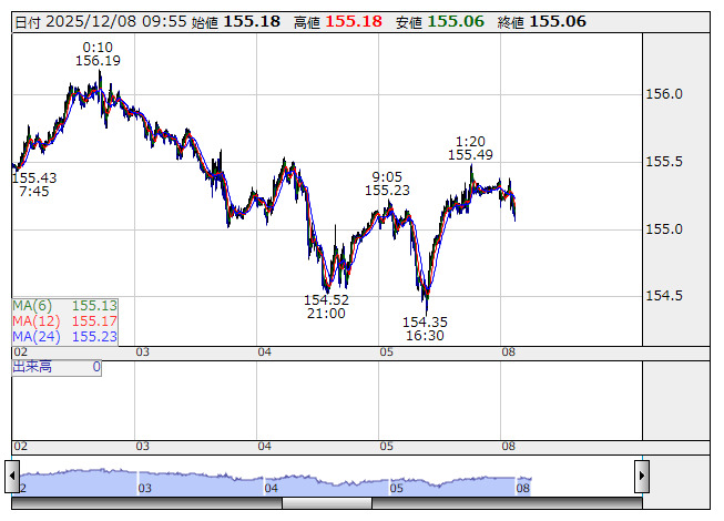 2025年12月08日10時01分 【通貨】外為:1ドル155円07銭前後とドル高・円安で推移 米ドル/円 <5分足> 「株探」多機能チャートより 8日の外国為替市場のドル円相場は午前10時時点で1ドル=155円07銭前後と、前週末午後5時時点に比べ44銭のドル高・円安。ユーロ円は1ユーロ=180円68銭前後と34銭のユーロ高・円安で推移している。 株探ニュース