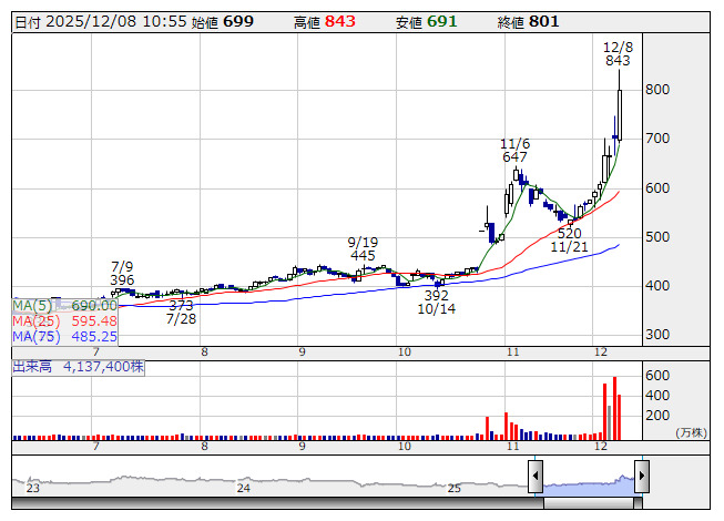 6629>の上値追い鮮烈、一時139円高の843円とストップ高まであと11円に迫る急騰を演じた。11月下旬からにわかに人気化し、直近8営業日では横ばいで取引を終えた4日を除き、すべて上昇する異色の上げ足を披露している。株価水準的にも21年12月以来4年ぶりの高値圏に浮上した。同社はタイテックブランドで展開するロボティクス事業で、モータ制御技術を駆使した安全・安心なソリューション提供でFA業界の需要を取り込んでおり、人工知能(AI)とロボティクスの融合によるフィジカルAIのテーマにおいて関連有力株に位置付けられている。業績も好調を極め、今上期(25年4~9月)の営業利益は前年同期比6倍となる8億9100万円と急拡大、通期の営業利益は前期比3.2倍の12億円を予想しているが、一段の上振れの可能性が意識されている。