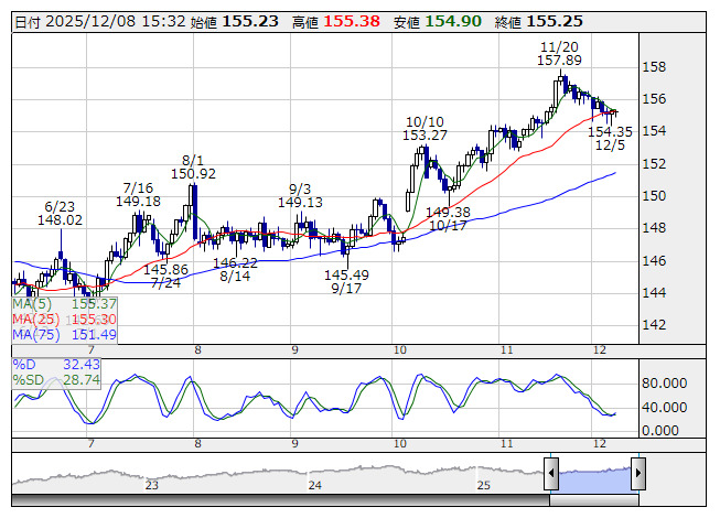 米ドル/円 <日足> Slowストキャス 「株探」多機能チャートより8日午後の東京市場でドル・円は底堅く推移し、155円20銭台でのもみ合いが続く。日経平均株価はプラスを維持しており、日本株高を好感した円売りに振れやすい展開。一方、ユーロは買い優位となり、ドルや円、スイスフランに対して強含んだ。