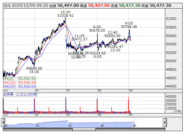 2025年12月09日09時21分 【市況】日経平均の下げ幅が100円を超える 日経平均 <5分足> 「株探」多機能チャートより 日経平均株価の下げ幅が100円を超えた。9時20分現在、104.64円安の5万477.3円まで下落している。 株探ニュース