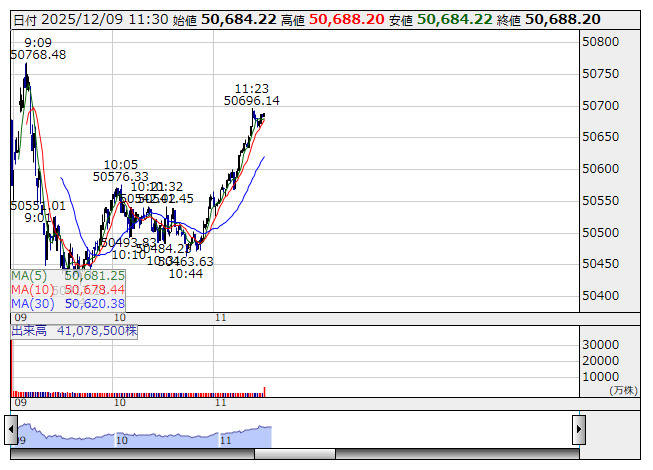 【市況】日経平均9日前引け=続伸、106円高の5万688円