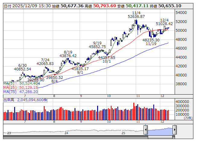 大引けの日経平均は前日比73.16円高の50655.10円となった。東証プライム市場の売買高は20億4509万株、売買代金は4兆8935億円、業種別ではゴム製品、海運業、医薬品などが値上がり率上位、その他製品、不動産業、パルプ・紙などが値下がり率上位となっている。東証プライム市場の値上がり銘柄は35.2%、対して値下がり銘柄は60.3%となっている。