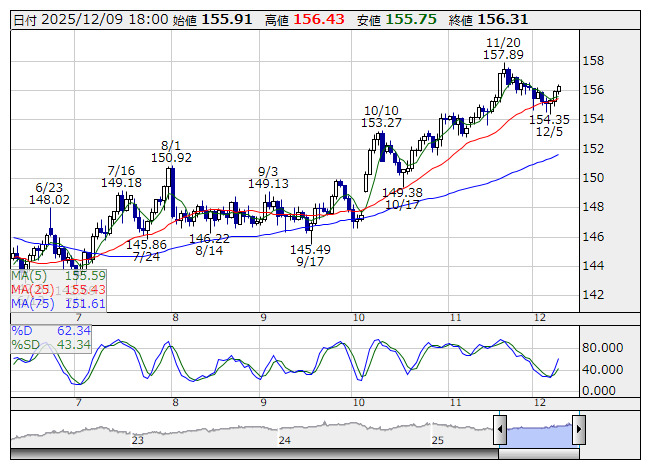 2025年12月09日18時01分 【通貨】外為:1ドル156円33銭前後とドル高・円安で推移 米ドル/円 <日足> Slowストキャス 「株探」多機能チャートより 9日の外国為替市場のドル円相場は午後6時時点で1ドル=156円33銭前後と、午後5時時点に比べ14銭のドル高・円安。ユーロ円は1ユーロ=182円04銭前後と24銭のユーロ高・円安で推移している。 株探ニュース