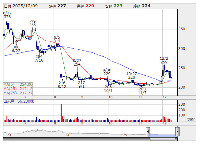 カルナバイオ <4572> 303 +79 (+35.3%) 197,800 ( 6,013) 176,200 ( 5,338)