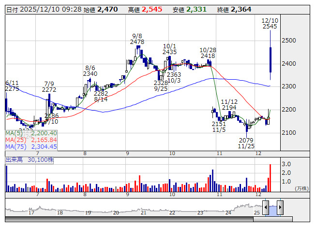 大幅に続伸。26年4月期の営業利益予想を従来の7.00億円から7.80億円(前期実績5.43億円)に上方修正している。太陽光発電設備の業績好調による追加計上分を織り込んだため。第2四半期累計(25年5-10月)の営業利益は3.04億円(前年同期実績1.61億円)で着地した。太陽光発電設備が好調に推移し、開発・施工案件の進捗が前倒しで業績に寄与したことから会社計画(2.00億円)を上回った。