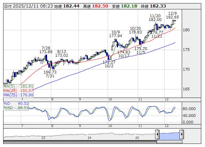 ユーロ/円 <日足> Slowストキャス 「株探」多機能チャートよりユーロ・ドルは、1.0341ドル(2017/01/03)まで下落したが、1.2537ドル(2018/02/18)まで上昇。その後、0.9536(2022/09/28)まで反落したが、2024年にかけて1.1ドル台まで戻している。ユーロ・円は英国民投票で欧州連合(EU)からの離脱が決定し、一時109円57銭(2016/06/24)まで急落。その後137円50銭(2018/2/2)まで買われたあと、長期間伸び悩んだが、日欧金利差の拡大や円安・ドル高の進行、日本銀行による12月利上げの可能性は大幅に低下したことから182円64銭(2025/12/9)まで一段高となった。欧州中央銀行(ECB)の政策金利は当面変更なしと予想されるが、来年中に利上げに転じる可能性があるため、リスク回避的なユーロ売り・円買いがただちに拡大する可能性は低いとみられる。