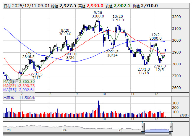 2025年12月11日09時01分 【テク】近鉄GHD---ダブルボトム形成からのリバウンド 近鉄GHD <日足> 「株探」多機能チャートより <9041> 近鉄GHD 2908.5 +30 調整トレンドは継続しているが、足もとで2800円処でのダブルボトム形成からのリバウンドで25日線を捉えてきており、同線突破から3000円近辺に位置する75日、200日線が射程ん位入ってきそうだ。一目均衡表では雲を下回って推移しているが、遅行スパンは実線に接近しており、上方シグナルを発生させる可能性が高まってきている。 《FA》 提供:フィスコ