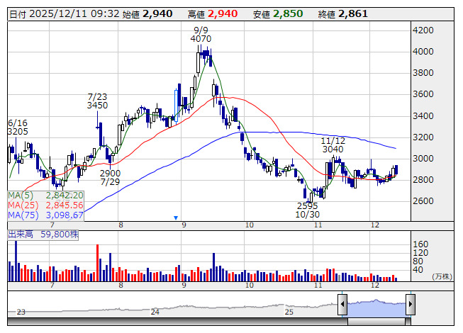 2025年12月11日09時32分 【材料】山岡家は反落、11月月次好調も 山岡家 <日足> 「株探」多機能チャートより 丸千代山岡家<3399>は反落。10日取引終了後、11月度の売上高速報を発表した。既存店売上高は前年同月比15.7%増と、高い伸び率を維持した。全店ベースでは同21.8%増だった。好調な月次を発表するも、株価への反応は限定的となっている。 出所:MINKABU PRESS