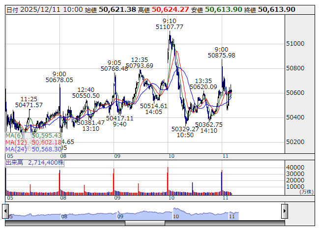 【市況】10時の日経平均は21円高の5万624円、アドテストが195.21円押し上げ