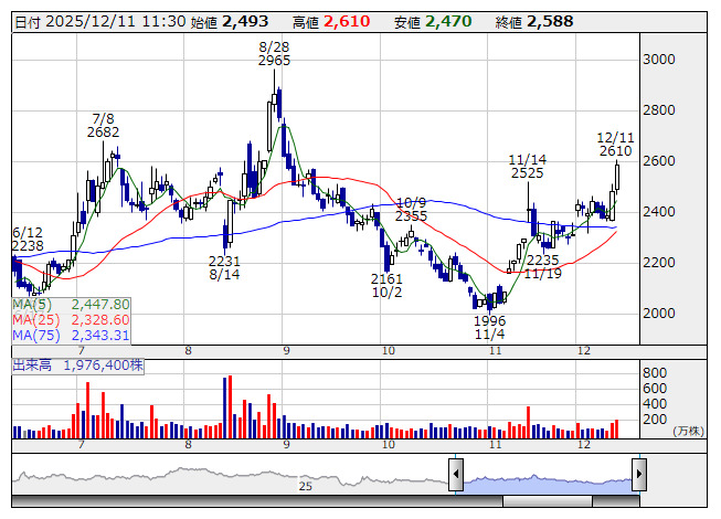 芝浦メカトロニクス<6590>が3日ぶりに反発した。同社は11日、次世代半導体パッケージ向けのパネル用ウェットスピン装置を開発したと発表。今後の収益貢献を期待した買いが株価の支えとなったようだ。多様な材料に対して高度な洗浄・エッチング技術が必要となる次世代半導体パッケージの製造工程において、大型パネル向けに展開することを目的として開発した装置で、サーバーや生成AIに使用されるGPU(画像処理半導体)の「2.XD製品」を製造する際、大型の角型ワークに対し高度かつ高性能なウェット処理を実現。開発から研究までカバーする柔軟なユニット構築と、量産展開に対応できる点なども特長とする。
