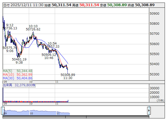 日経平均 <1分足> 「株探」多機能チャートよりきょう前場の東京株式市場は冴えない地合いだった。米連邦公開市場委員会(FOMC)での利下げ決定を受けて前日に米株高となった流れを引き継ぎ、日経平均は朝方高く寄り付いたものの、すぐに値を消しマイナス圏に沈んだ。前引けの水準がこの日の安値となった。米オラクル<ORCL>が決算発表後に時間外で下落し、これが東京市場でも主力のAI・半導体関連株にネガティブな材料として意識された。特に、オラクルとAIデータセンター整備計画「スターゲート」で連携するソフトバンクグループ<9984>の下げがきつく、日経平均を押し下げた。FOMC後はドル安・円高に振れたこともあって、値下がり銘柄数はプライム全体で8割近くに及んだ。
