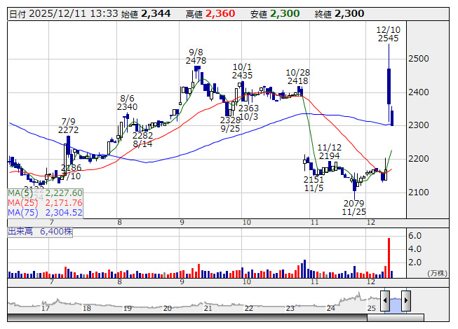 反落。100%子会社グリーンエナジー・プラスが宮崎県宮崎市阿波岐原町における系統用蓄電池施設の受注契約(定格出力1999kW、公称容量8146.8kWh)を締結したことを発表も上値は重い。系統用蓄電池は、再生可能エネルギーの発電量変動を調整し、電力系統の安定化を図るために活用される大容量蓄電システムである。同社では、今後も系統用蓄電池の導入を推進し、全国各地の自治体・企業との連携を強化することで、持続可能なエネルギーインフラの構築を目指していくとしている。