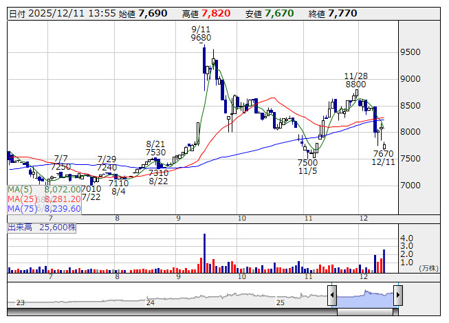 2923>が3日ぶりに急反落した。同社は10日の取引終了後、26年4月期第2四半期累計(5~10月)の連結決算を発表。売上高は前年同期比9.8%増の204億8000万円、営業利益は同2.3倍の20億2100万円、最終利益は同2.6倍の19億1400万円となった。あわせて未定としていた通期の業績予想について、売上高が前期比7.6%増の500億円、営業利益は同0.1%増の27億円、最終利益が同18.0%増の23億円となる見通しを示した。期末一括配当予想は70円と記念配当5円を含む前期の水準と横ばいを計画する。10月中間期は包装米飯及び包装餅製品ともに主力製品の販売が堅調に推移し、政策保有株の売却に伴う特別利益も発生した。同社の業績は鏡餅の販売が集中する第3四半期(11~1月)に収益が大きく増加する傾向がある。これを踏まえると今期の利益予想の水準には物足りなさが意識され、売りを促す要因となったようだ。