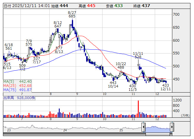 アイスタイル <日足> 「株探」多機能チャートより日本最大級の美容系総合サイト「@cosme」、化粧品専門ECサイト「@cosme SHOPPING」、化粧品専門店「@cosme TOKYO」や「@cosme STORE」を軸に、日本No.1の美容プラットフォームを構築しているアイスタイル<3660>の株価と業績のアンバランスが拡大している。中国からのインバウンド需要減少が懸念されているのだろうが、同社実店舗における売上のうち中国依存度は5%強に過ぎない。中期目標達成時のPER15倍は時価総額で840億円程度となり、現状の469億円から8割程度の上値余地がある。同様に中期目標達成時の営業利益CAGR+25~30%によれば、現状のPER17倍にもアップサイドポテンシャルを感じるだろう。