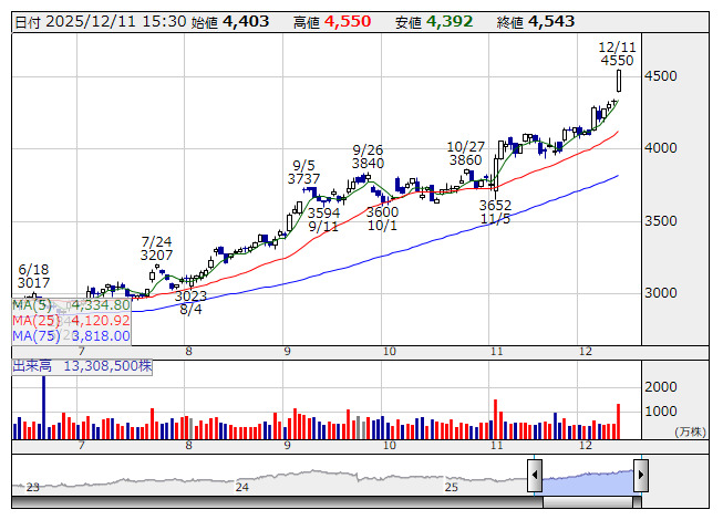モイ<5031>=上値追いに拍車。年初来高値を連日更新した。10日の取引終了後、26年1月期第3四半期累計(2~10月)の単独決算の発表にあわせて、通期業績予想を修正した。経常利益予想を前回予想の1億2900万円から3億7300万円(前期比45.8%増)に引き上げた。経常利益は減益予想から一転、前期の過去最高益を更新する見通しとなっており、業況を評価した買いが集まっている。売上高予想は前回予想の66億1000万円から66億1200万円(前期比0.3%増)と小幅に引き上げた。同社はライブ配信プラットフォーム「ツイキャス」を運営。ポイント販売の予想を下方修正した一方、メンバーシップやプレミア配信の売り上げ見通しを上方修正している。また、ポイント販売においてアプリ以外の決済手段の比率が上昇。手数料率の低下が販管費を圧縮する。自主音楽レーベル「Moi Records」の管理音楽に関する収益の増加も利益拡大に寄与する。最終利益予想は開示していない。2~10月は売上高が49億5400万円(前年同期比0.5%増)、経常利益が3億600万円(同52.7%増)、最終利益が1億3400万円(同13.1%減)となった。日本音楽著作権協会(JASRAC)と「ツイキャス」での楽曲利用に伴う収支報告の内容に関する認識の齟齬(そご)の解決に向けた協議が完了し、解決に伴う特別損失を計上した。なお、NexTone<7094>との間にも認識の齟齬が発生しており、解決に向けた協議を進めている。
