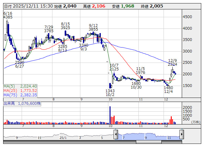 2025年12月11日16時38分 【材料】ハートシードが25年12月期営業益予想引き上げ、心筋細胞製造費用など想定を下回る ハートシード <日足> 「株探」多機能チャートより Heartseed<219A>は11日の取引終了後、25年12月期(24年11月~25年12月の14カ月間)の業績予想の修正を発表し、営業利益予想を前回予想の1億2500万円から3億1100万円に引き上げた。売上高予想は据え置く。研究開発費の試験費用や心筋細胞製造費用などが想定より抑制される。今期は決算期の変更に伴い、14カ月の変則決算となっている。 第4四半期累計(24年11月~25年10月の12カ月間)の単独決算も発表した。売上高30億2600万円、営業損益は7億2600万円の黒字だった。24年10月期は売上高が8億7300万円、営業損益は10億3800万円の赤字だった。 出所:MINKABU PRESS
