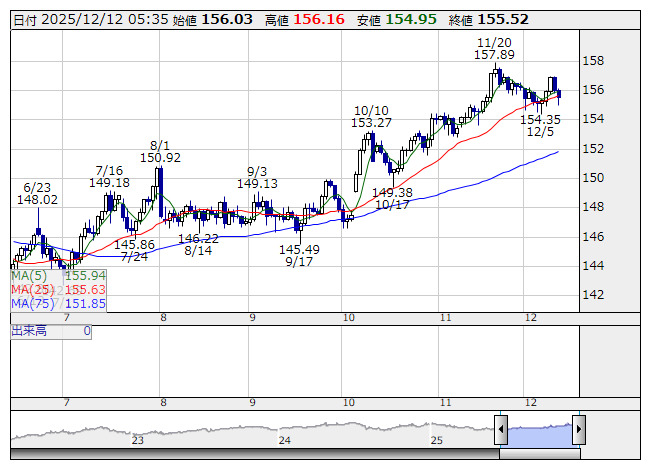 米ドル/円 <日足> 「株探」多機能チャートより11日のニューヨーク外為市場でドル・円は一時154円95銭まで売られたが、155円67銭まで反発。新規失業保険申請件数の増加を受けて長期金利は低下し、米ドル売り・円買いが活発となった。ただ、日本の財政悪化に対する警戒感は消えていないため、調整的な円買いは一服し、米ドルお買い戻す動きがみられた。ユーロ・ドルは1.1713ドルから1.1763ドルまで上昇した。ユーロ・円は反転し、181円88銭まで売られた後、182円75銭まで買われた。ポンド・ドルは、1.3438ドルまで買われた後、1.3383ドルまで反落。ドル・スイスは0.7968フランから0.7924フランまで下落。