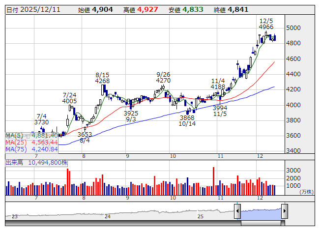 三井住友FG <日足> 「株探」多機能チャートより(東証上場 4254 銘柄対象[ETF、REIT含む])