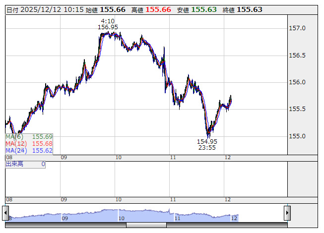 米ドル/円 <5分足> 「株探」多機能チャートより11日のニューヨーク外国為替市場のドル円相場は、1ドル=155円59銭前後と前日に比べ40銭強のドル安・円高で取引を終えた。前週分の米新規失業保険申請件数が弱い内容となったことを受けて一時154円95銭まで軟化した。