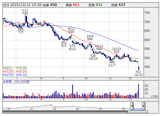2025年12月12日10時57分 【材料】セルソース---急落、今期の営業赤字・無配転落見通しを嫌気 セルソース <日足> 「株探」多機能チャートより セルソース<4880>は急落。前日に25年10月期の決算を発表、営業利益は1.7億円で従来予想の2億円を下振れ。主力事業である加工受託サービスや医療機器販売において受注が計画に届かなかったもよう。加えて、26年10月期は1.7億円の赤字に転じる見通しで、年間配当金も無配を計画している。既存事業の構造転換に伴う売上減や先行投資が膨らむもよう。加えて、スタンダード市場への市場区分変更に向けた方針も発表。 《HM》 提供:フィスコ