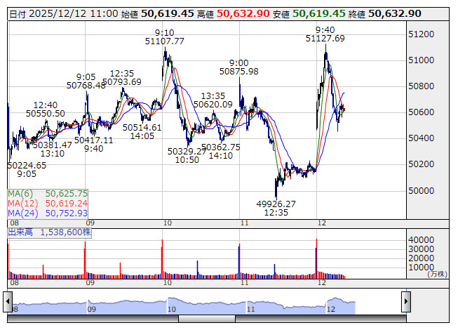 【市況】11時の日経平均は470円高の5万619円、ファストリが129.16円押し上げ