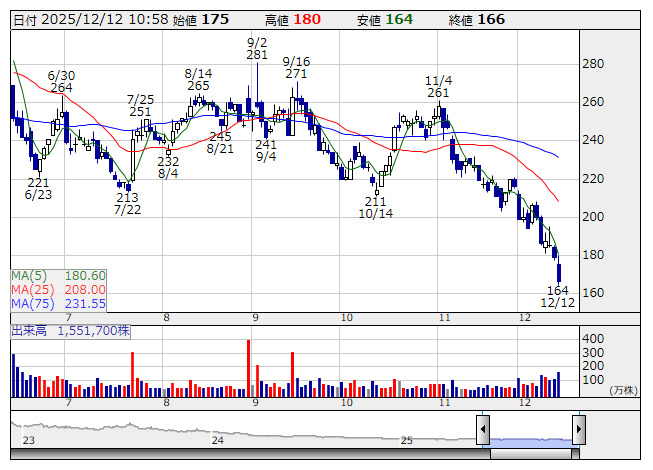 6619>は大幅続落。前日に第3四半期の決算を発表、累計営業損益は43.3億円の赤字となり、8-10月期も14.6億円の赤字を計上している。通期計画は43億円の赤字予想を継続しているが、経常損益は73億円の赤字から103億円の赤字見通しに下方修正。EV向け需要が当初の見込以上に回復が遅れている中、欧州のEV向けを主力事業としている持分法適用会社の収益が想定以上に悪化のもよう。厳しい業績動向の継続に先行き警戒感が強まる展開。