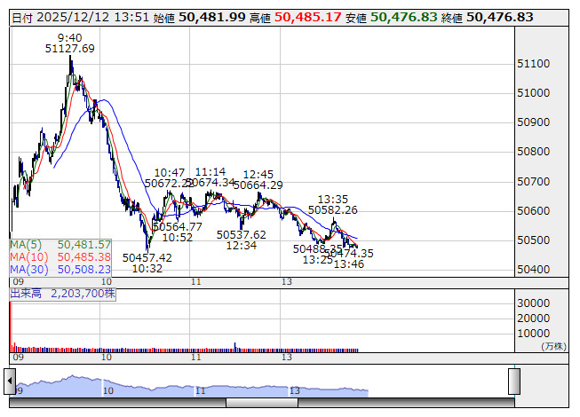 日経平均は上値の重い展開となっている。今日は週末ということに加え、来週は、16日に11月の米雇用統計、18日に11月の米消費者物価指数(CPI)が発表され、また、18-19日には日銀金融政策決定会合が開かれることから、これらを見極めたいとする向きもあり、積極的な買いは総じて見送られているようだ。一方、ダウ平均先物が時間外取引で堅調に推移していることが東京市場の株価下支え要因となっているようだ。