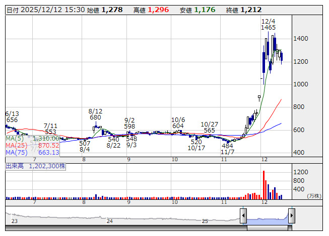 2025年12月12日18時40分 【市況】本日の【増資・売り出し】銘柄 (12日大引け後 発表分) ラクオリア <日足> 「株探」多機能チャートより ○ラクオリア <4579> [東証G] HK inno.Nを割当先とする155万5900株の第三者割当増資を実施する。発行価格は907円。 [2025年12月12日] 株探ニュース