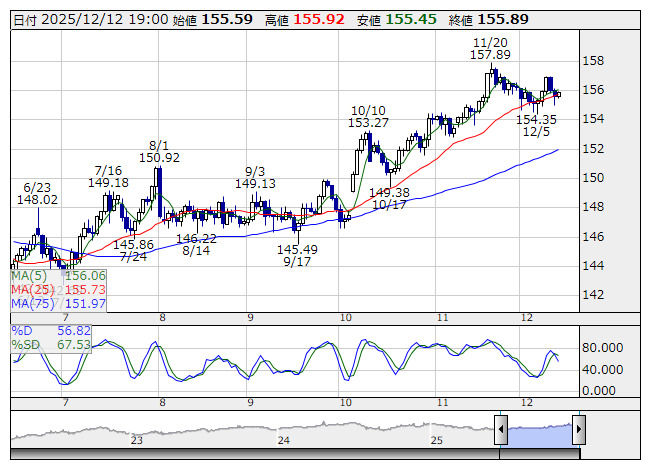 2025年12月12日19時01分 【通貨】外為:1ドル155円88銭前後とドル高・円安で推移 米ドル/円 <日足> Slowストキャス 「株探」多機能チャートより 12日の外国為替市場のドル円相場は午後7時時点で1ドル=155円88銭前後と、午後5時時点に比べ23銭のドル高・円安。ユーロ円は1ユーロ=182円89銭前後と19銭のユーロ高・円安で推移している。 株探ニュース