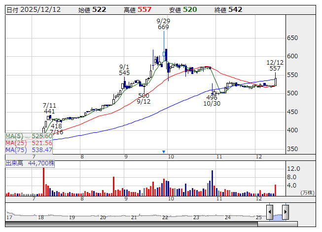 SCAT <日足> 「株探」多機能チャートより12月12日引け後に、株主優待制度について発表した銘柄を取り上げた。