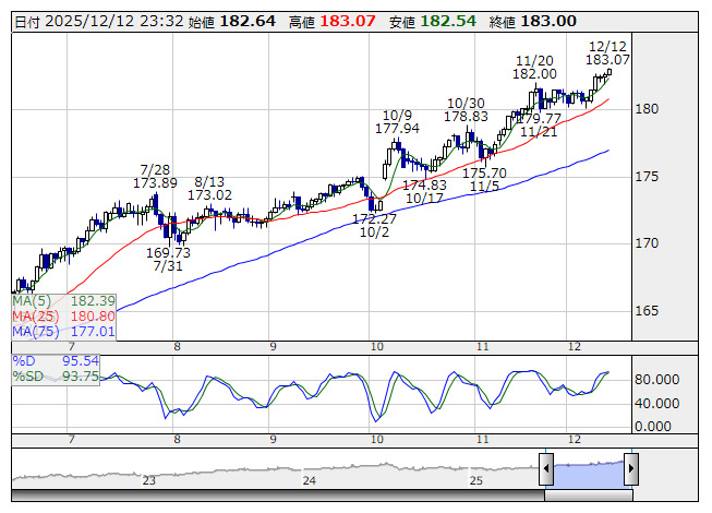 2025年12月12日23時32分 【通貨】NY為替:ユーロ・円は183円03銭まで強含み、連日の高値更新 ユーロ/円 <日足> Slowストキャス 「株探」多機能チャートより 12日のNY市場でドルは下げ渋り、155円90銭から156円10銭まで反発。ユーロ・円は強含み、182円88銭から183円03銭まで上昇。ユーロ・ドルは1.1735ドルから1.1723ドルまで反落。 《MK》 提供:フィスコ