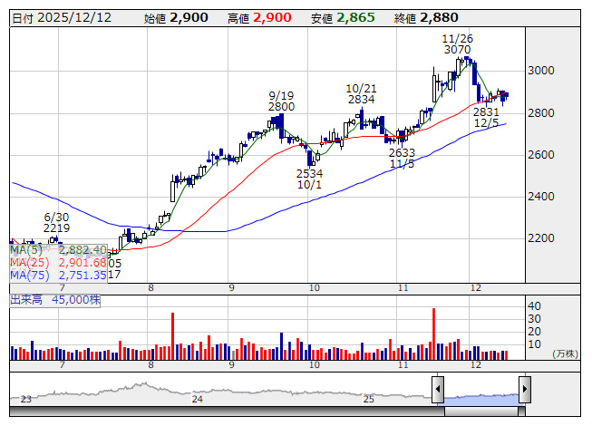 ダイコク電 <日足> 「株探」多機能チャートより●ダイコク電 <6430> 【目標株価】3300円(12日終値2880円)