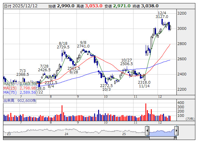 3位に入った太陽ホールディングス <4626> [東証P]の7-9月期(第2四半期)は、エレクトロニクス事業で半導体パッケージ基板用部材やリジッド基板用部材の販売が伸びたほか、医療・医薬品事業では既存顧客からの受託数量が増加し、経常利益は前年同期比35.1%増の84.2億円と2四半期連続で過去最高益を達成した。業績好調に伴い、26年3月期の同利益を従来予想の237億円→265億円に上方修正し、従来の2期連続での過去最高益予想をさらに上乗せした。併せて、11月30日を基準日として1株を2株にする株式分割の実施も発表。株価は上場来高値圏を快走する展開となっている。