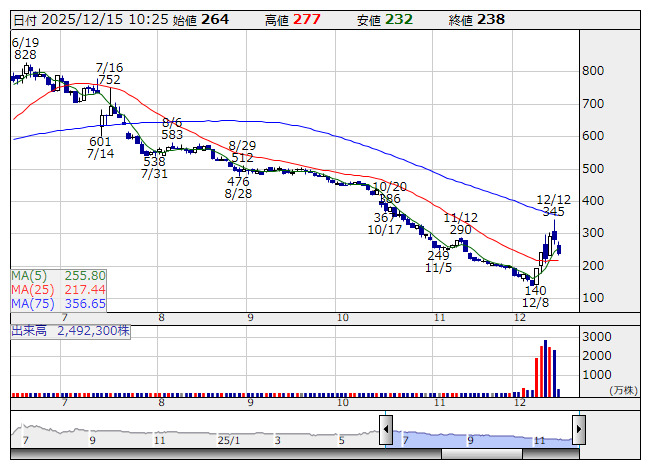 大幅続落。東京証券取引所が15日から同社株の信用取引による新規の売付け・買付けに係る委託保証金率を50%以上(うち現金20%以上)にすると発表したことを受けて、これを嫌気した売りに押されている。また、日本証券金融も増担保金徴収措置の実施を発表し、同日以降、貸借取引自己取引分および非清算参加者ごとの清算取次貸借取引自己取引分の貸借担保金率を50%(うち現金担保分20%)にするとしている。