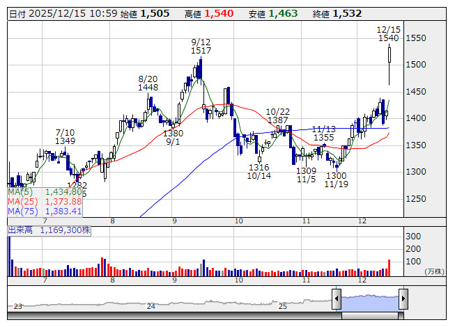 2025年12月15日11時00分 【材料】丹青社---大幅続伸、業績・配当予想を上方修正 丹青社 <日足> 「株探」多機能チャートより 丹青社<9743>は大幅続伸。先週末に第3四半期の決算を発表、累計営業利益は79.2億円で前年同期比2.2倍となり、通期予想は従来の75億円から86億円、前期比67.1%増に上方修正している。良好な市場環境を背景に需要が増加する中、収益性を重視した受注活動が寄与し、主に商業その他施設事業およびチェーンストア事業の収益が上振れるもよう。年間配当金も従来計画の70円から72円に引き上げ、前期比では27円の増配となる。 《HM》 提供:フィスコ