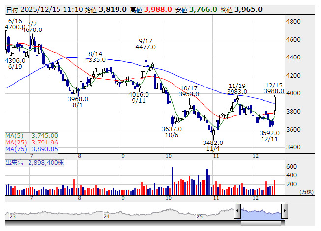 3038>は大幅続伸。前日に25年10月期の決算を発表している。営業利益は399億円で前期比16.1%増、8日に発表した上方修正水準での着地に。一方、26年10月期は430億円で同7.8%増の見通しとしており、ほぼコンセンサス並みの水準となっている。保守的な傾向が強いとみられている中、期初のガイダンスとしてはポジティブに捉えられているようだ。中計目標数値は410億円であった。また、年間配当金も前期比2円増の32円配を計画している。